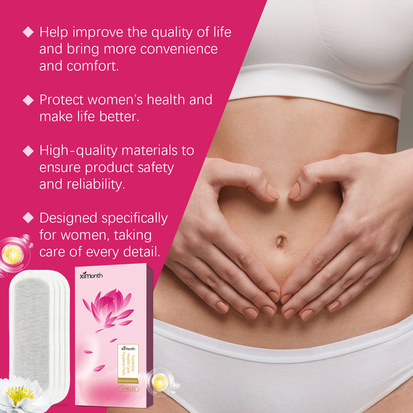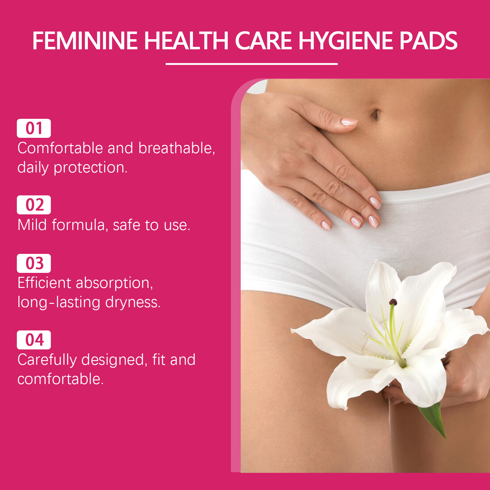 Our feminine hygiene pads contain snow lily extract, wild chrysanthemum extract and matrine root extract. It soothes the skin and leaves a fresh feeling; Antioxidant protection keeps you healthy. Gentle treatment for sensitive skin. Its use method is very simple: 1. Tear off the back of the protective paper; 2. Apply the product to clean underwear and put it on. 3. Replace it promptly and discard it after use. Feminine hygiene pads are highly breathable designed to stay dry and comfortable, suitable for daily use. Strong water absorption, fast lock wet, durable dry.