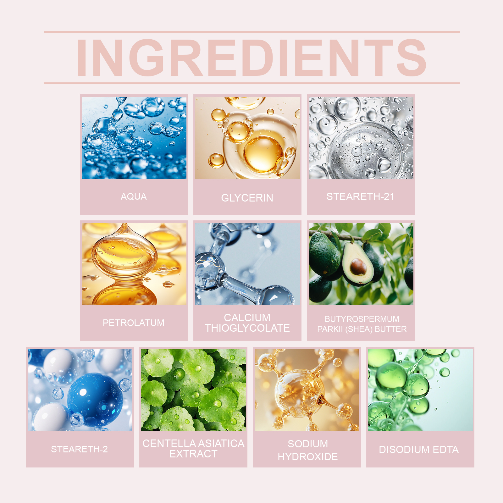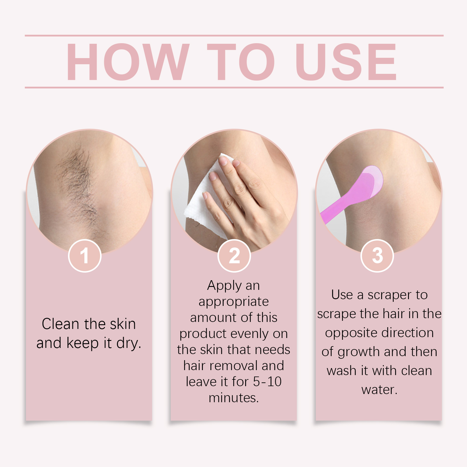 Our nourishing hair removal cream is carefully blended with glycerin, stearOL-21 and mineral grease. Designed for skin care, it won't feel tight after use and is suitable for daily care needs. Easy to use: clean your skin and keep it dry. Apply an appropriate amount of this product evenly to the skin in need of hair removal and leave it on for 5-10 minutes. Use a spatula to scrape off the hair against the direction of growth, then rinse with water. And can be easy to use, can be completed in a short time to remove hair, saving time, energy and efficiency. The formula is gentle and safe for sensitive skin, avoiding irritation and discomfort.